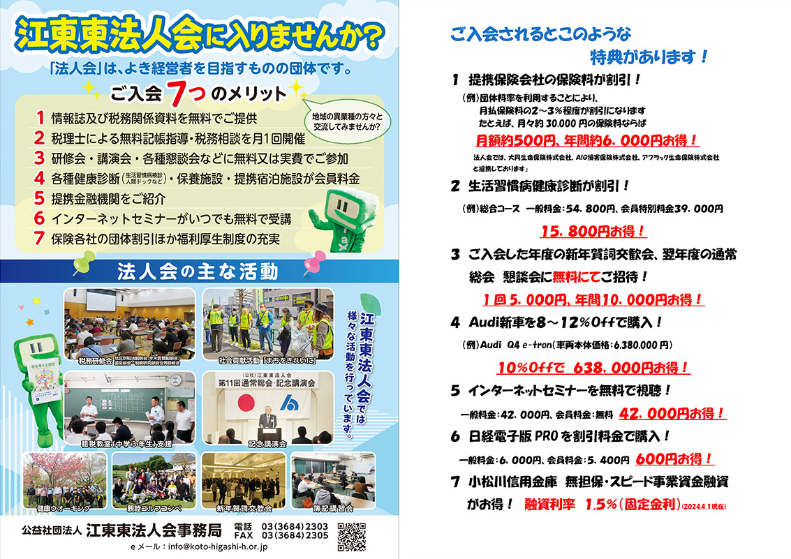 私達、江東東法人会は単位会の一つとして昭利25年4月に「正しい税務知識の普及と納税道義の高揚を目的として」申告納税制度の発足を契機に設立し、昭和41年に東京国税局長の認可を得て社団法人(公益法人)となり、今日に至りました。